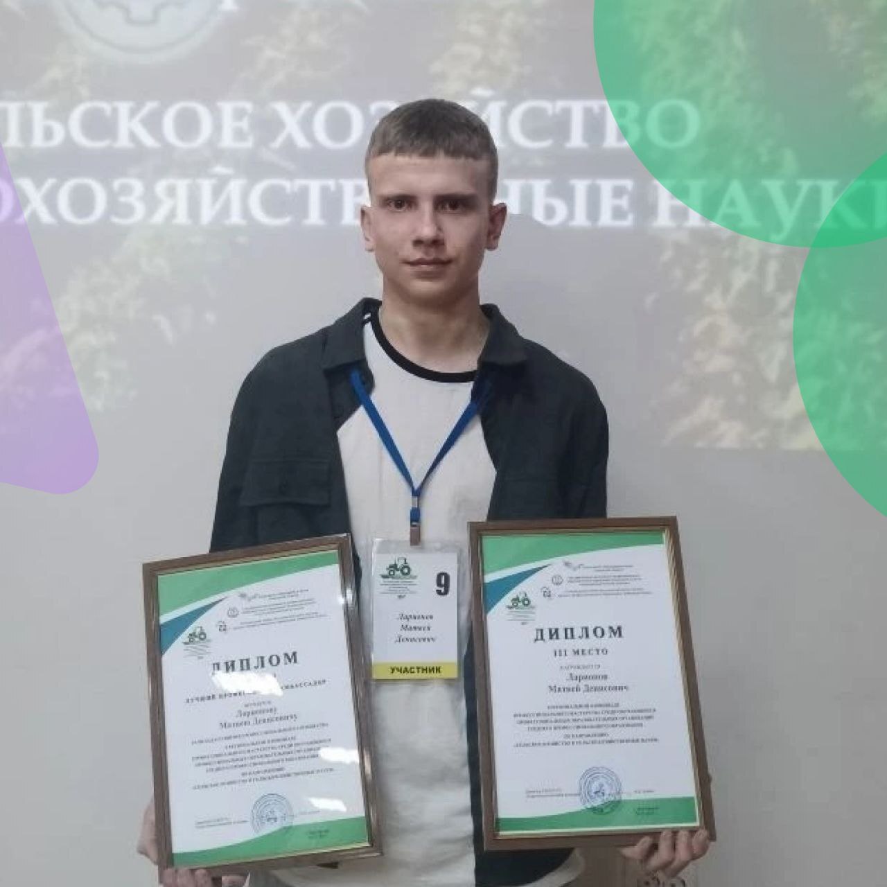 Матвей Ларионов из Агротехнологического отделения стал бронзовым призером региональной олимпиады по направлению «Сельское хозяйство». А еще получил диплом профессионала-амбассадора за вклад в развитие отрасли.